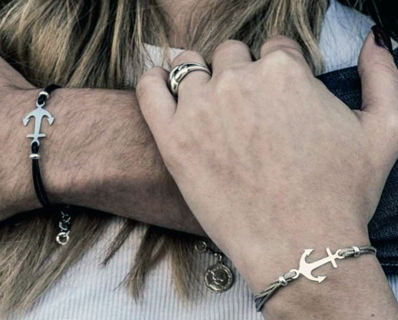 A colored bracelet is the right solution to liven up even the most formal and office men's outfits. Noah is made with a two-tone blue nautical cord and a central charm with a compass rose and a contrasting rotating golden anchor.